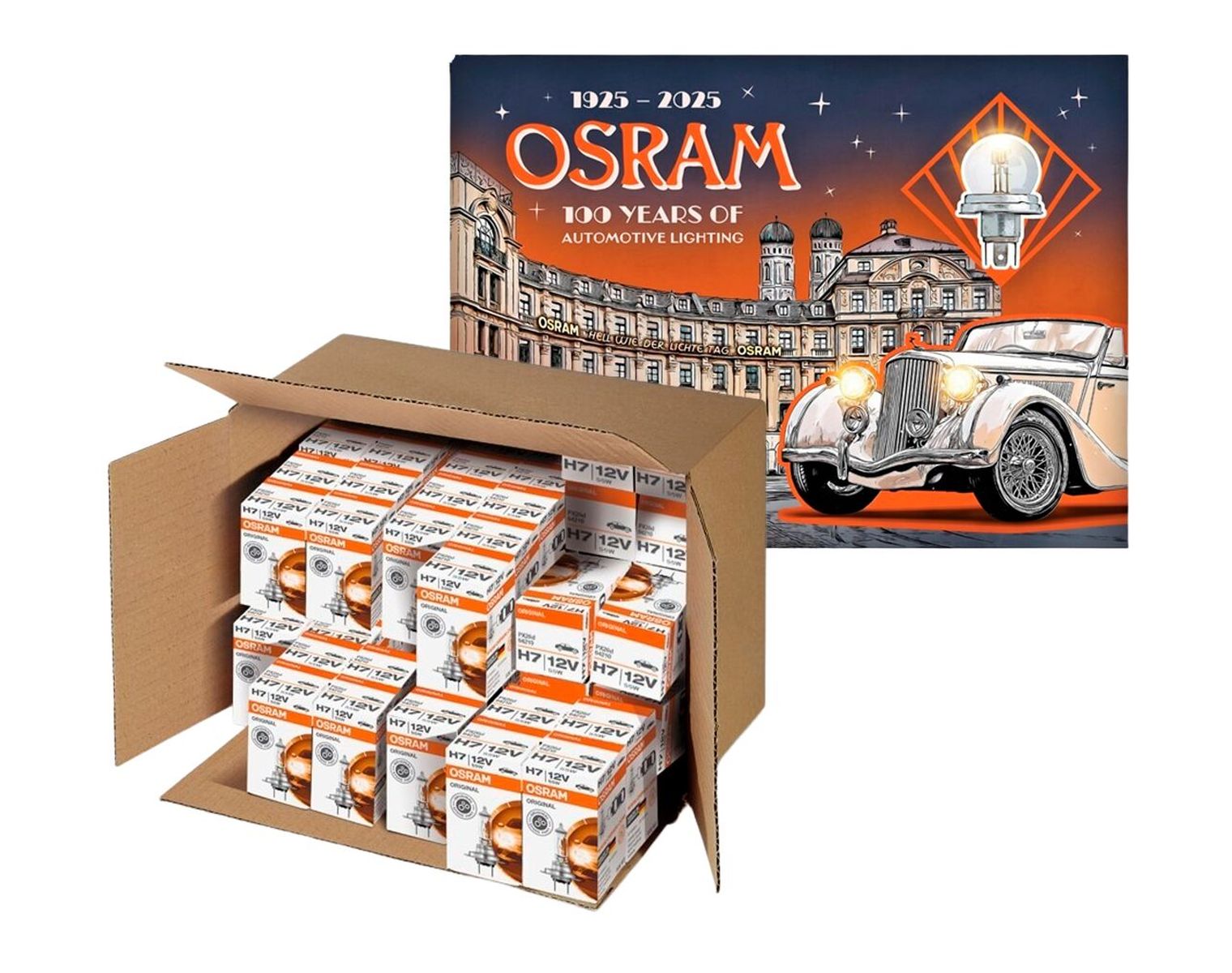 Entdecken Sie das exklusives Lichtpaket: 30× OSRAM H7 Original 64210 Autolampen für optimale Sicht + ein kostenloses OSRAM Retro-Metallschild mit dem historischen "100 Jahre Autolampen"-Design. Perfekt für Autofans und Werkstätten. Aktion nur gültig, solange der Vorrat reicht – jetzt zugreifen!