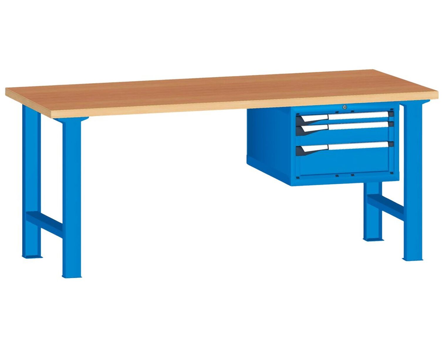 Werkbank mit Multiplexplatte Buche 50 mm. Stahlkonstruktion. Drei abschliessbare Schubläden, Höhe 50 mm, 100 mm und 150 mm. Tragkraft 500 kg. B x T x H 2'000 x 800 x 900 mm. Farbe RAL 5012 Lichtblau.