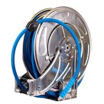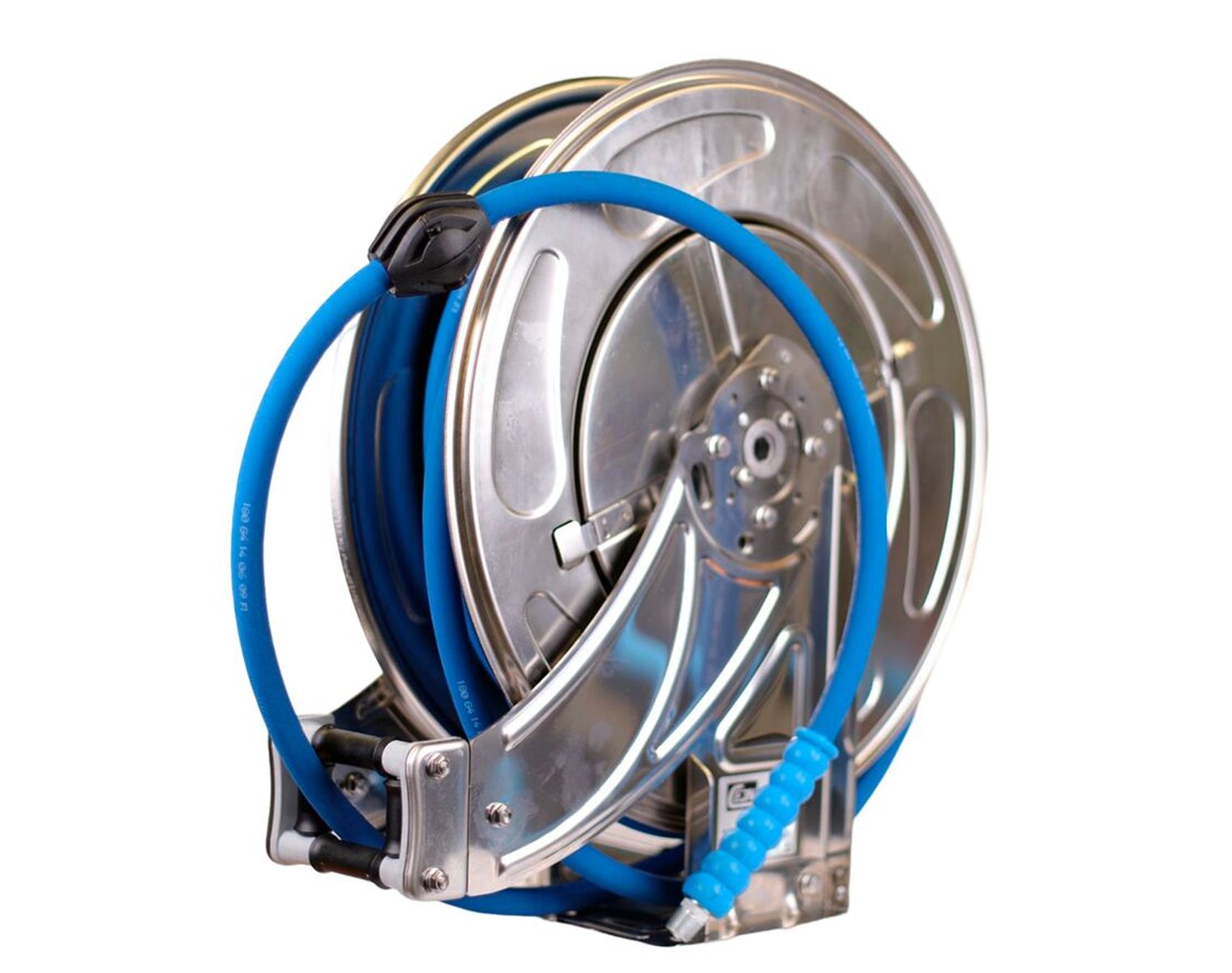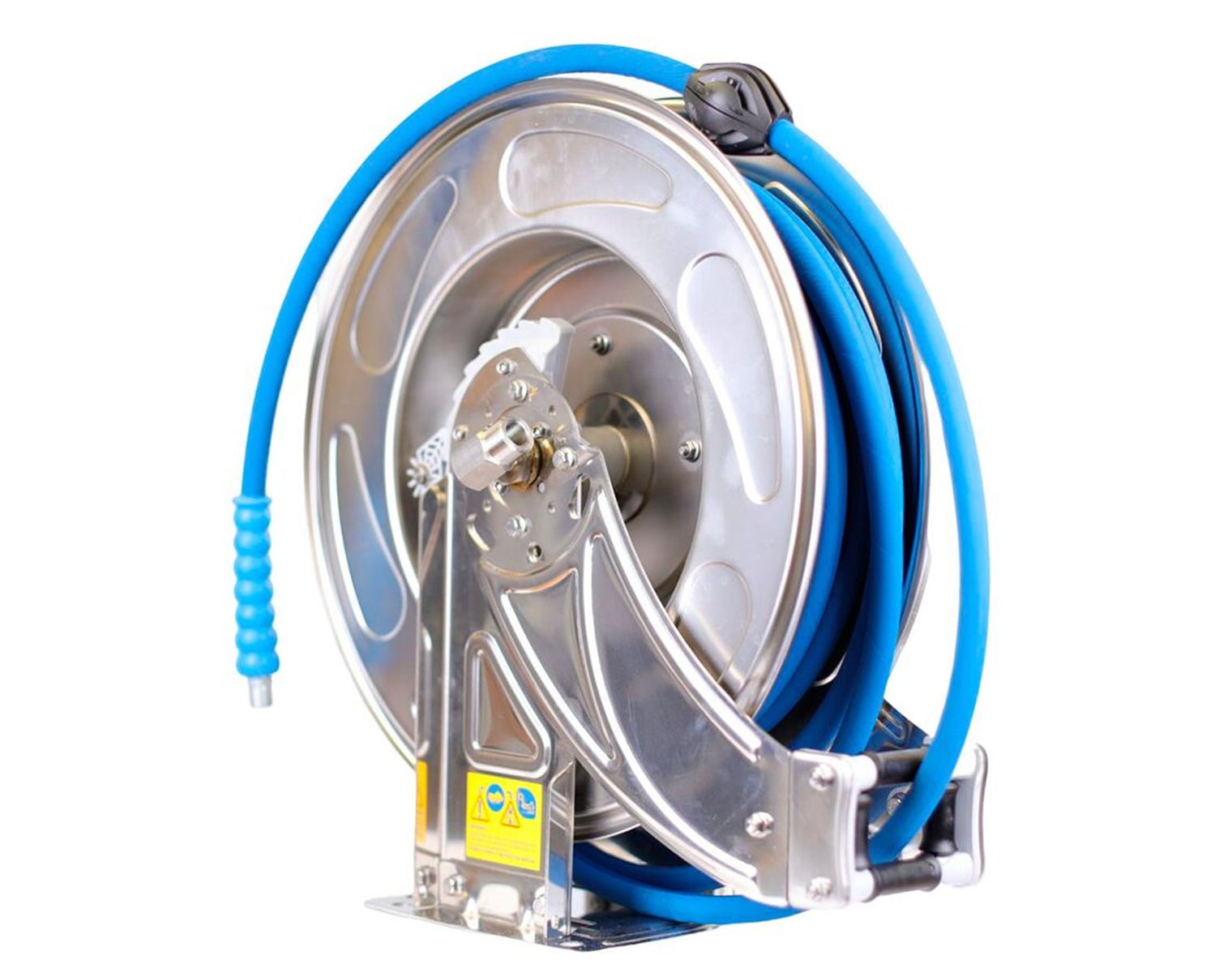 Il robusto Avvolgitubo in acciaio inossidabile (AISI 304) offre 15 metri di tubo flessibile in gomma NBR per Acqua, Aria compressa e Altri liquidi. Con una pressione di esercizio fino a 400 bar e un intervallo di temperatura compreso tra 5 e 150 °C, è ideale per le officine e gli ambienti corrosivi. Il meccanismo a molla detentore del tubo lo tiene lontano dal pavimento e garantisce un immagazzinamento sicuro e poco ingombrante. Le connessioni sono G 3/8" femmina e R 3/8" maschio.