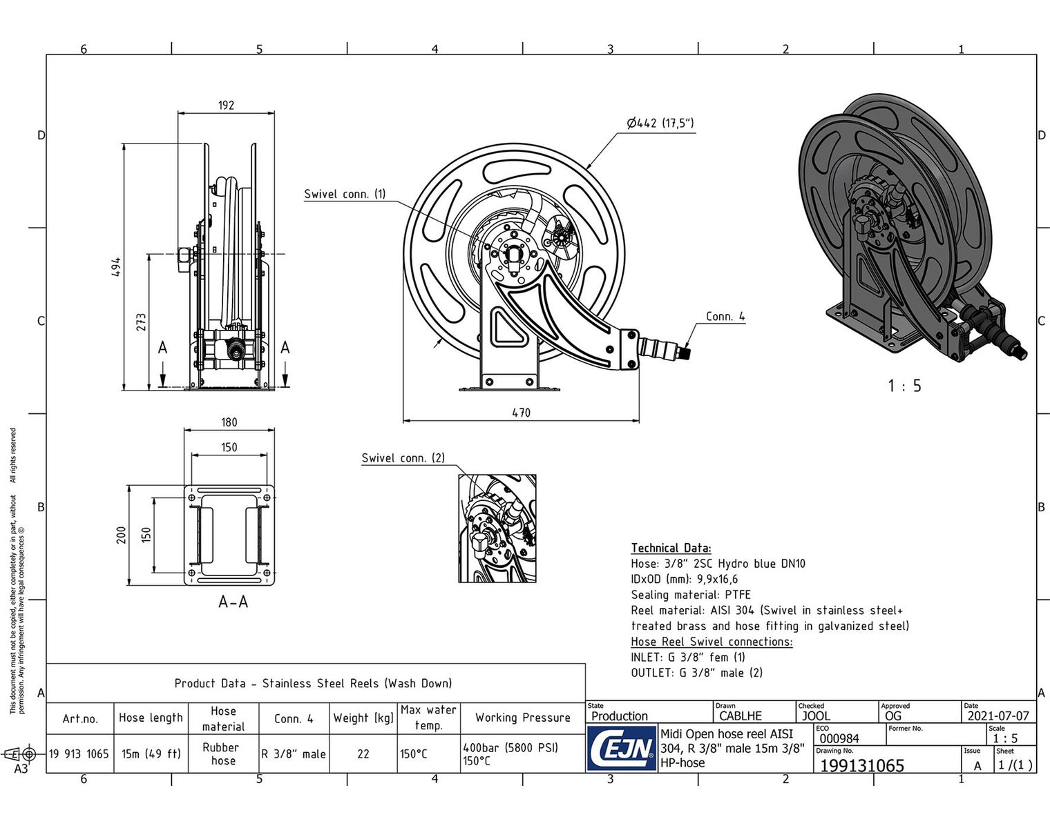 CEJN Avvolgitubo per liquidi e aria compressa, aperto, in gomma NBR, 15 m, 9,9 × 16.6 mm, R 3/8"